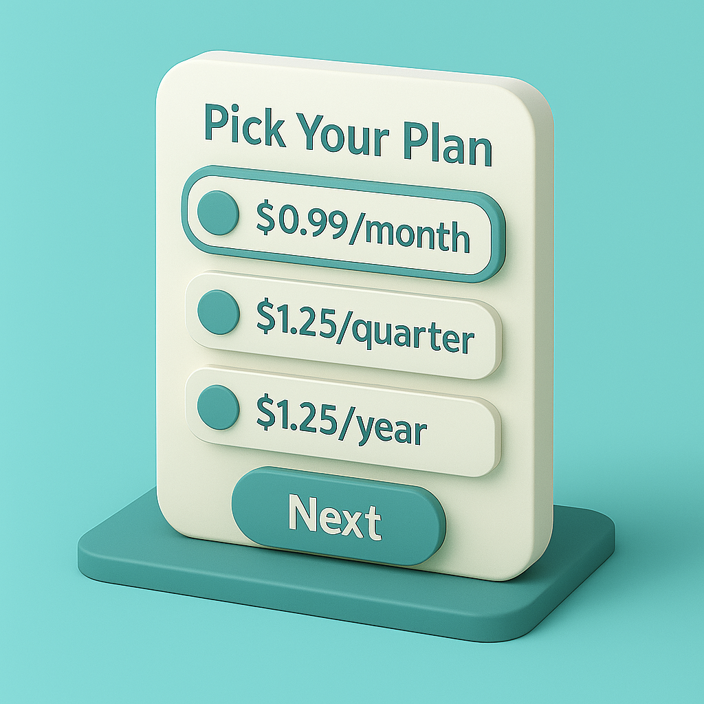 Choose from flexible plans: $0.99/month, $1.25/every 3 months, or $1.25/year. (Or try our new MULTI 59¢ Plan!)